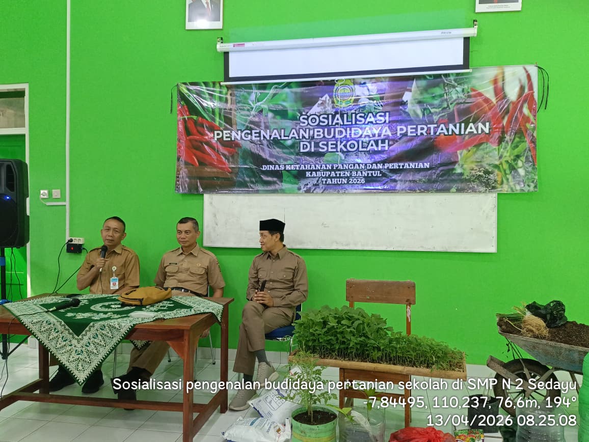 Dalam rangka mengenalkan dunia pertanian kepada generasi muda serta mendukung program swasembada pangan, Pemerintah Kabupaten Bantul melalui Dinas Ketahanan Pangan dan Pertanian menyelenggarakan kegiatan Sosialisasi Pengenalan Budidaya Pertanian di Sekolah. Kegiatan ini dilaksanakan sejak awal April hingga Mei 2026 di sejumlah Sekolah Dasar (SD) dan Sekolah Menengah Pertama (SMP) di Kabupaten Bantul. Salah satu kegiatan dilaksanakan pada Senin (13/4/2026) di SMP Negeri 2 Sedayu, Bantul.